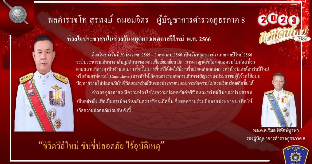สาสน์ ผบช.ภ.8 ห่วงใยประชาชนช่วงวันหยุดยาวปีใหม่ พ.ศ.2566